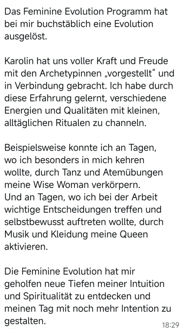 Wenn du spürst, dass dich das Feminine Evolution Programm ruft, aber noch etwas unklar ist – Schreib mir eine E-Mail an karolin@feminineevolution.de – ich unterstütze dich gerne, herauszufinden, ob das Programm das richtige für dich ist.